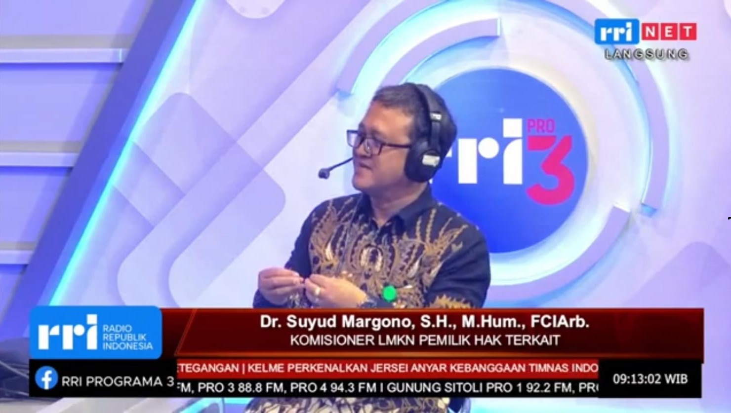 SUYUDLAW.COM - Royalti terhadap penggunaan sekunder (secondary used) terhadap lagu/ musik yang diputar pada ruang publik tidak saja Kompensasi/ imbalan ekonomi, namun juga apresiasi bagi Pencipta/ Pemegang Hak, Pelaku Pertunjukan (Performers) dan Produser Fonogram. Hal ini disampaikan Suyud Margono, Komisioner LMKN Hak Terkait dan Aji Mirza Hakim, Komisioner LMKN Hak Cipta pada acara Live Talkshow Pro 3 RRI disiarkan baik secara digital youtube maupun frekuensi. 88.8 FM, langsung dari Studio Pro 3 RRI, Jl. Medan Merdeka Barat No. 4-5, Jakarta Pusat, pada Jumat, 13 Maret 2026.